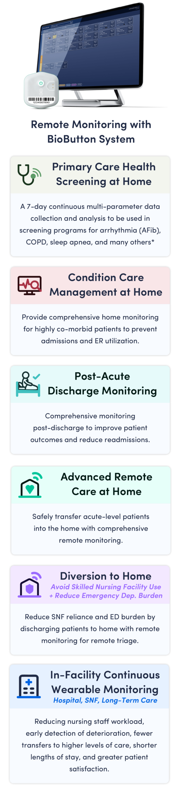 *Facility management and screening of specific diseases or conditions can be assisted by BioButton device monitoring and associated data. These claims are not within the intended use of the device as cleared by the FDA.